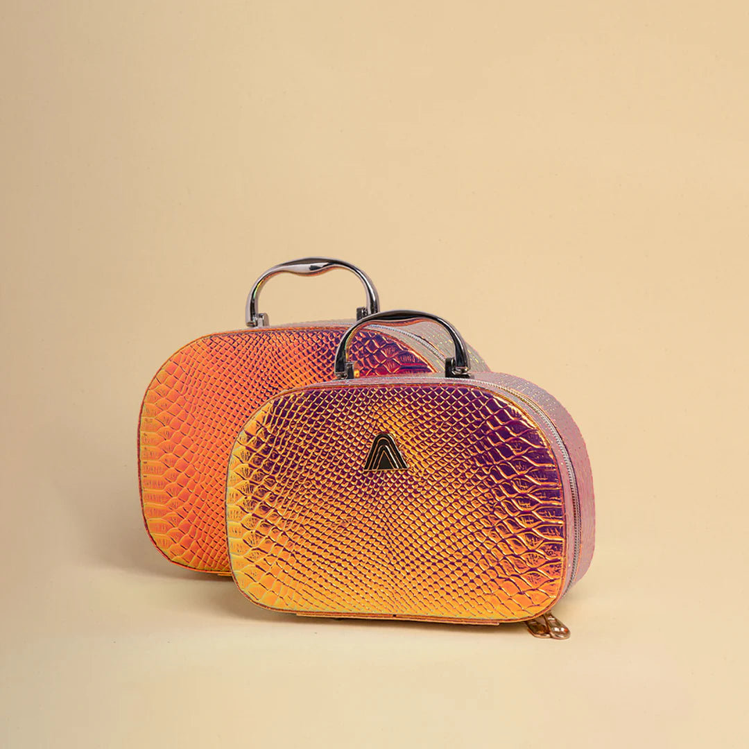 Su diseño rígido con acabado tornasol, doble cierre y agarre manual la convierten en una opción funcional y con mucho estilo.